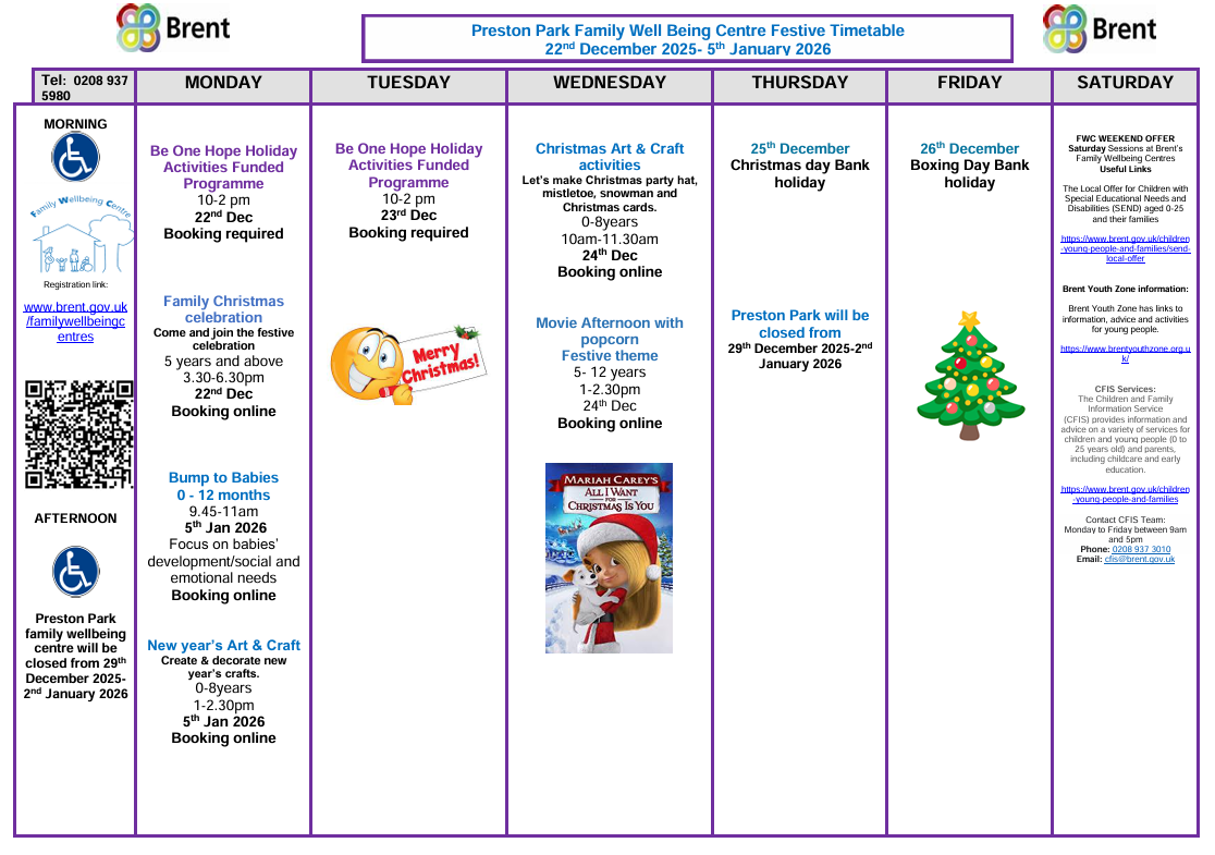 Family Wellbeing Centre Festive Timetable