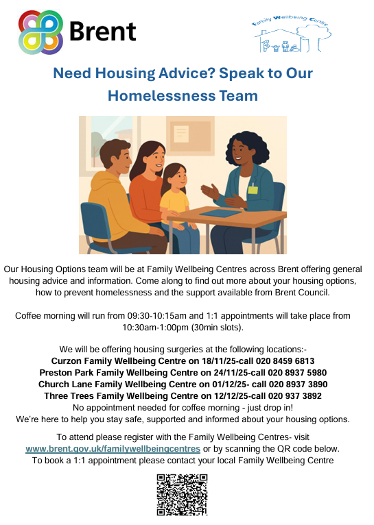 Preston Park Family Wellbeing Centre and other FWC’s will be holding housing advice services this month and in December.  There will be coffee mornings and 1:1 appointment for those in need of advice.